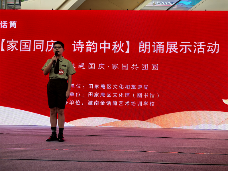 为庆祝国庆、欢度中秋,弘扬爱国主义精神,传递团圆和谐的家庭观念,由田家庵区文化和旅游局主办,田家庵区文化馆(图书馆)承办,淮南金话筒艺术培训学校协办的“家国同庆 诗韵中秋”朗诵展示活动9月27日下午在淮南万达广场隆重举行。