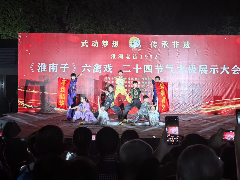 为丰富国庆假日群众文化生活,弘扬中华优秀传统文化,10月7日晚,由区文旅局主办的“武动梦想 传承非遗”——《淮南子》养生操(六禽戏)、二十四节气养生太极展示活动在淮滨街道淮河老街1952区域成功举办。