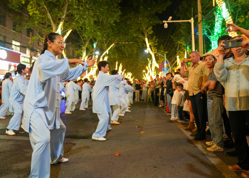 活动在喜庆的锣鼓秧歌表演中拉开帷幕,为国庆假日的夜晚增添了浓厚的文化氛围。随后,二十四节气养生太极、《淮南子》六禽戏、太极13式等非遗项目依次亮相,表演者们动作行云流水、刚柔并济,充分展现了传统养生文化的独特魅力。活动尾声,一场精彩的武术表演将现场气氛推向高潮,其磅礴的气势和精湛的技艺赢得了观众阵阵掌声。