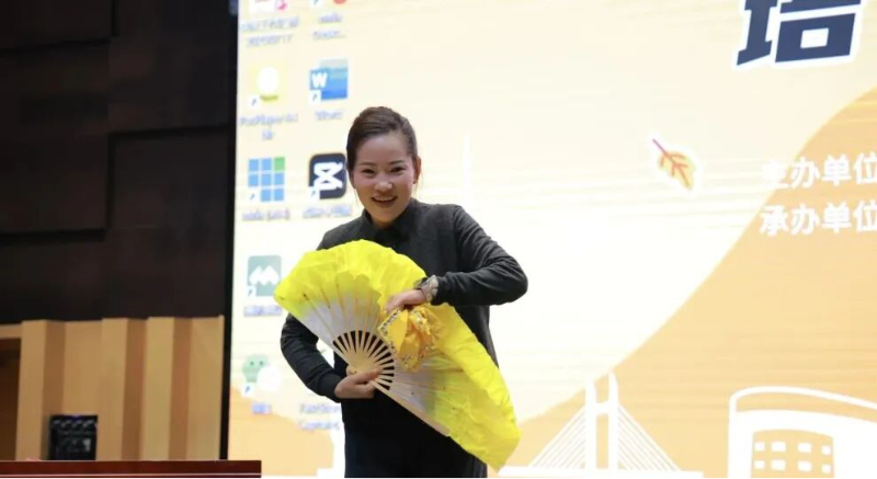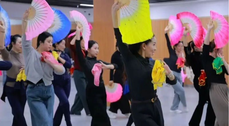 王团长带领授课团队,以“大兰花组合”为教学重点,分小组指导学员练习,从柔美扇舞的手势变换,到动作与步伐的协作,再到整体动作与音乐节奏的配合,逐一纠正细节,确保每位学员都能精准掌握大兰花组合“舒展大气、灵动优雅”的风格精髓。学员们热情高涨,反复打磨动作,课堂上满是挥舞的彩扇与整齐的舞步,非遗技艺的感染力在互动中充分释放。