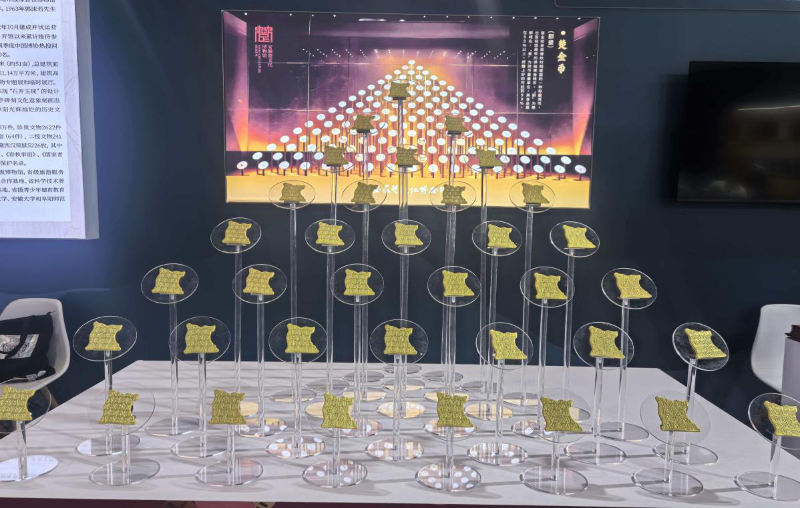 本次参展的文创产品深度挖掘馆藏文物价值,围绕三大核心主题展开:以楚金币为原型,打造复刻其纹理与形制的系列衍生品,其中整面墙展示的楚金币冰箱贴成为展区视觉焦点;提取“长宜子孙”铭文蕴含的吉祥寓意,开发香膏挂件等兼具实用与文化内涵的产品;依托东汉累丝镶宝八龙纹金带扣的精美纹饰,设计出网红冰箱贴等爆款单品,该产品此前已入围中国特色旅游商品。这些产品将古老文物与现代审美巧妙融合,展现了楚文化的浪漫底蕴与当代活力。