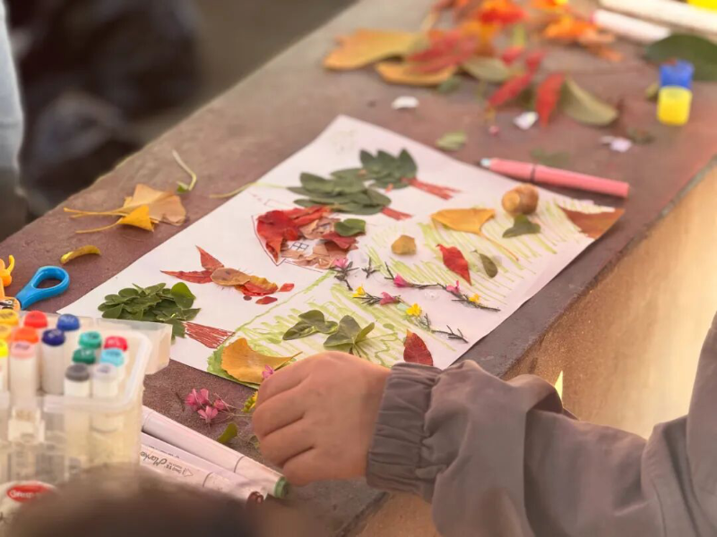 树叶DIY环节热闹非凡,亲子围坐一起随意创作。有的拼贴可爱图案,有的搭配创意画面,有的组合独特造型,落叶在亲子协作中变成一幅幅充满童趣的画作。