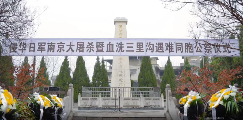 公祭仪式上,全体肃立奏唱中华人民共和国国歌,各界代表向三里沟遇难同胞纪念碑敬献了花篮,全体人员向遇难同胞默哀,学生代表进行了发言。随后,全体人员缓步列队,将手中的鲜花敬献在纪念碑前,表达哀思,祈愿和平,从历史中汲取前进力量。