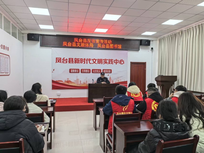 2026年1月28日,由凤台县文旅局主办、凤台县图书馆承办的反诈宣传活动,在县新时代文明实践中心举办。活动特邀县公安部门同志开展反诈知识宣讲,工作人员结合我县近期发生的诈骗典型案例进行详细解读,以案释法、以例警示,切实引导现场群众提升反诈防骗意识,筑牢反诈安全防线。