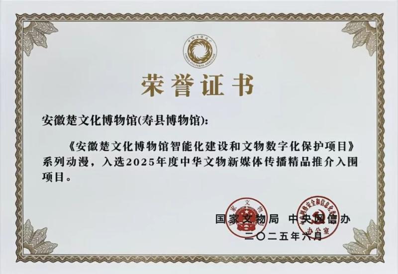 近日,由国家文物局、中央网信办主办,中国文物报社承办的“中华文物新媒体传播精品推介入围项目”名单公布,安徽楚文化博物馆联合安徽省安泰科技股份有限公司精心打造的《安徽楚文化博物馆智能化建设和文物数字化保护项目》系列动漫,入选2025年度中华文物新媒体传播精品推介入围项目。