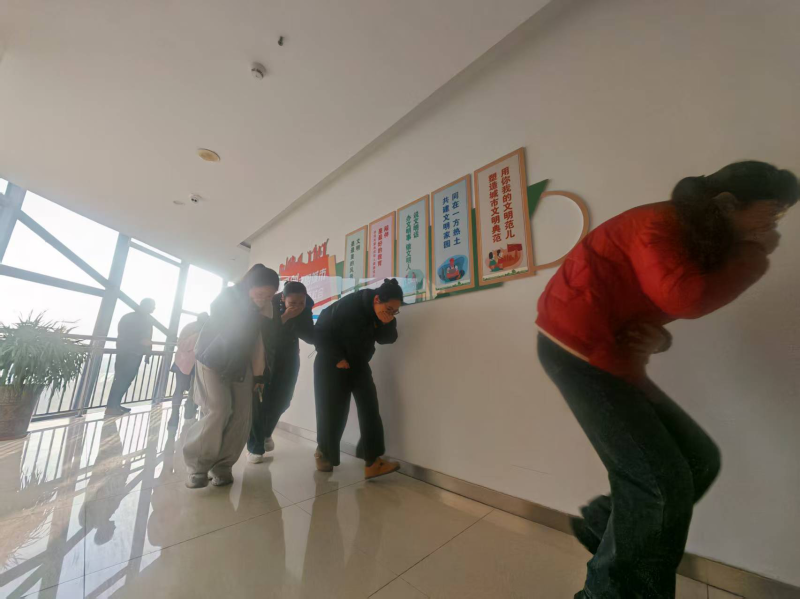 培训结束后,模拟火灾场景发生后,工作人员按照预案迅速就位,引导在场人员弯腰低姿、捂住口鼻,沿着指定疏散通道快速有序撤离至室外安全区域,整个过程紧张有序、配合默契,有效检验了疏散引导机制的实用性。